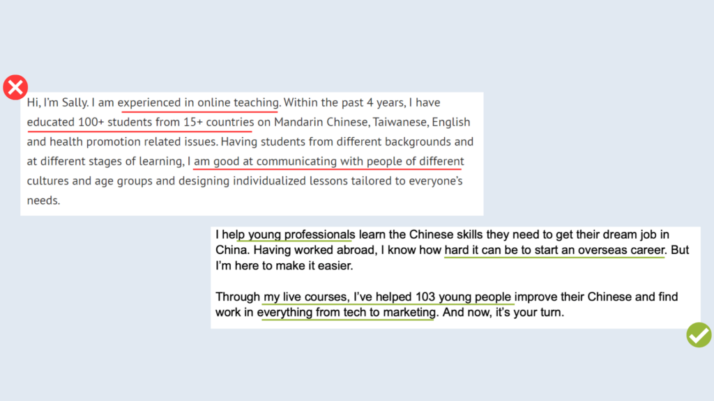 So instead of leading with what makes you qualified, start with what you can do for the reader. This creates an emotional connection that increases the chances they’ll buy.